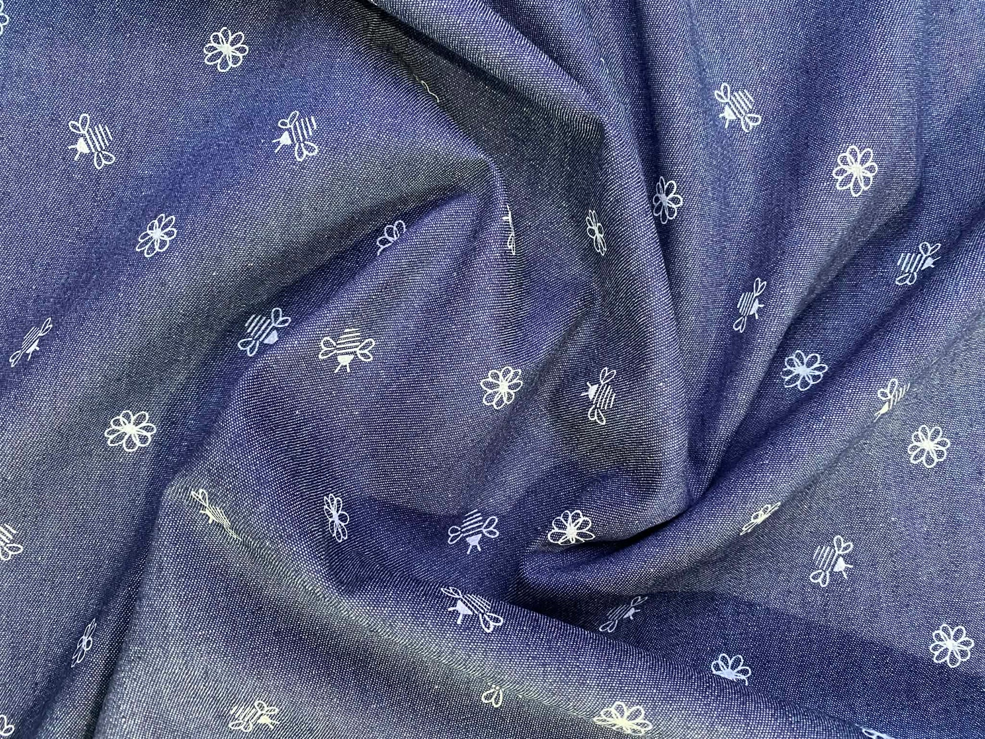 100% Cotton Denim/Chambray - Blue/White - Bees - 58"Wide - Sold By The Metre