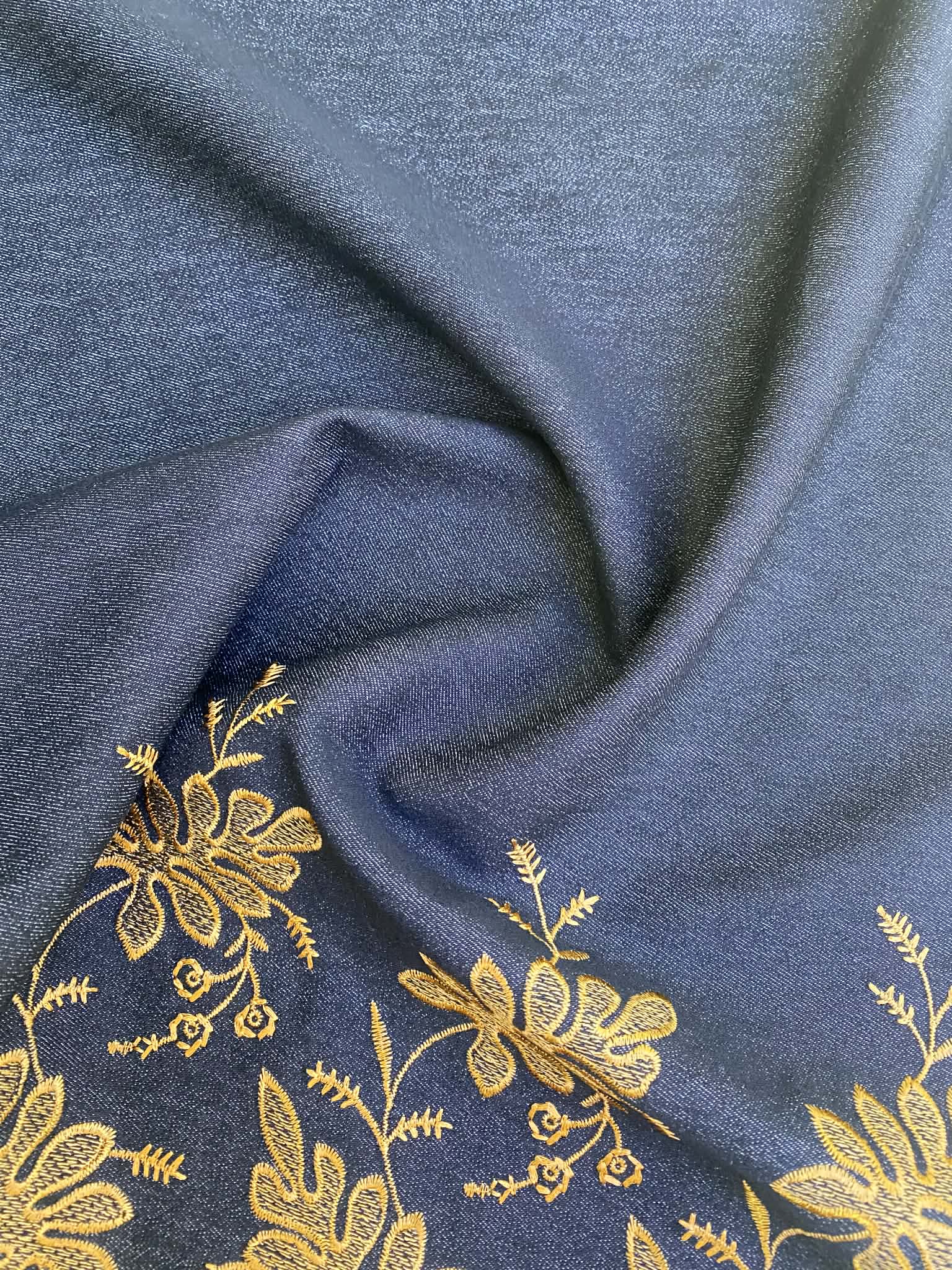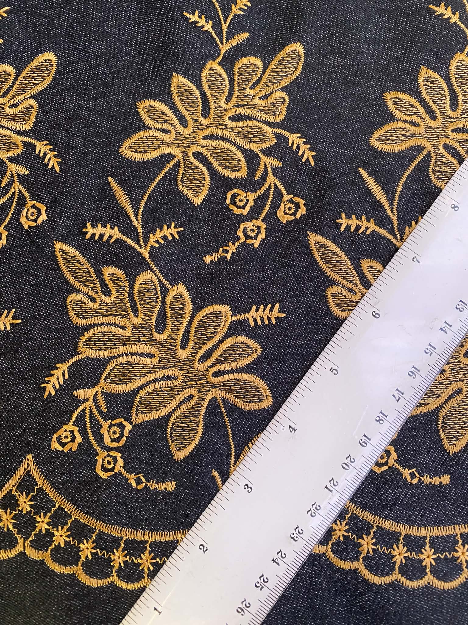 Add a touch of designer opulence to your wardrobe with our Black and Gold Floral Embroidered Denim. This medium-weight stretch denim features a rich, jet-black base decorated with high-density gold embroidery in a bold, vintage-inspired floral pattern. With its unique double-bordered design and intricate arched scalloped edge, this fabric is truly one-of-a-kind.