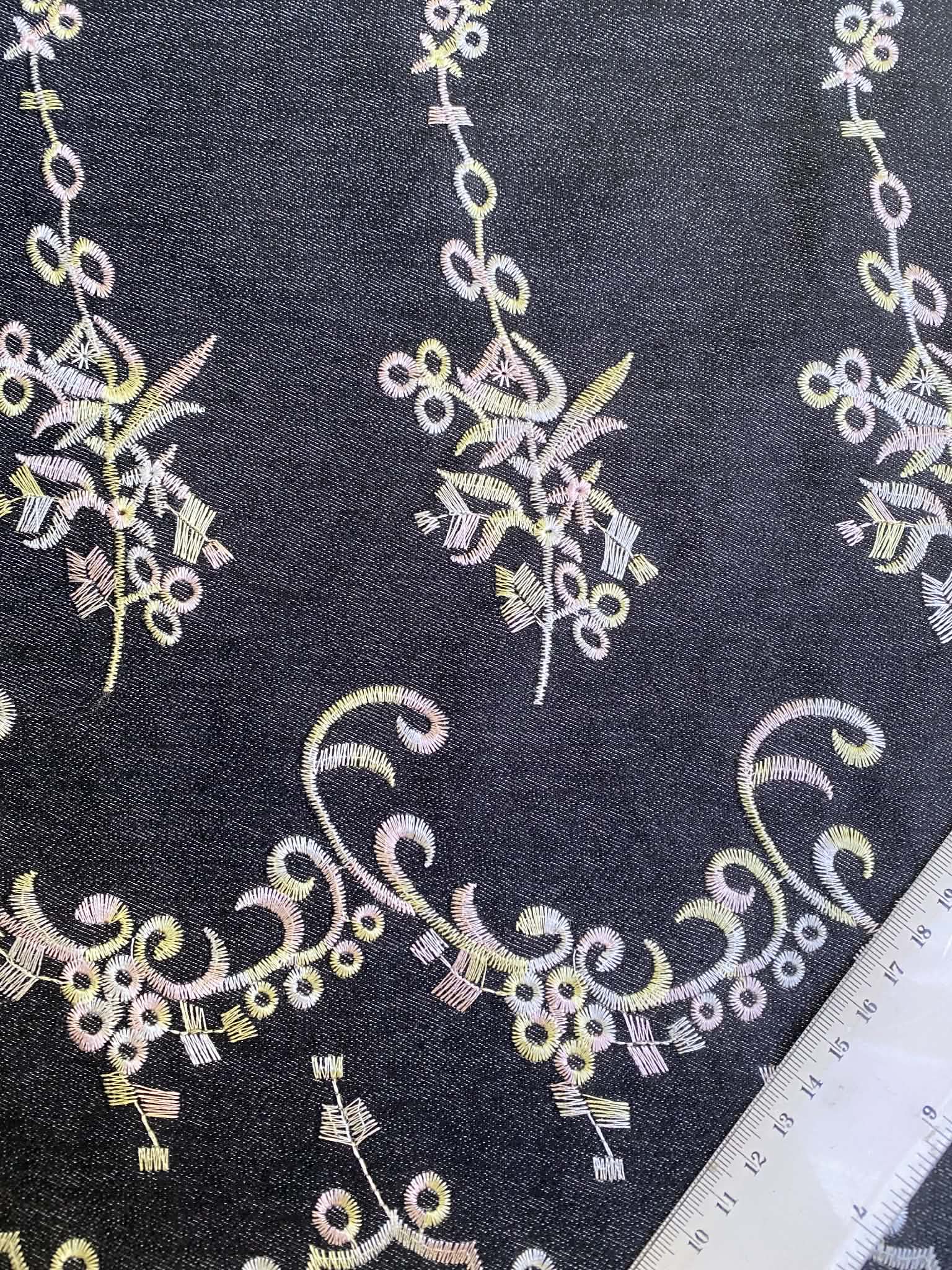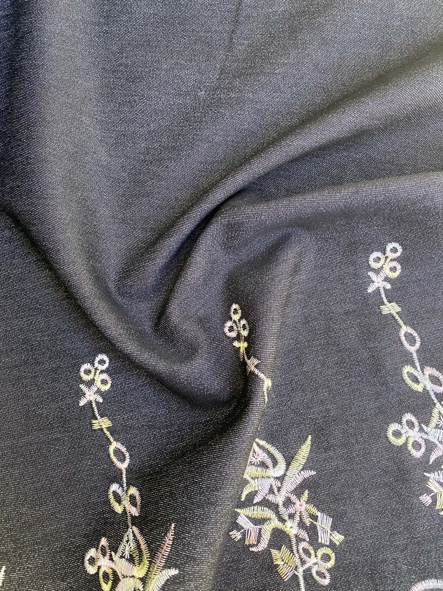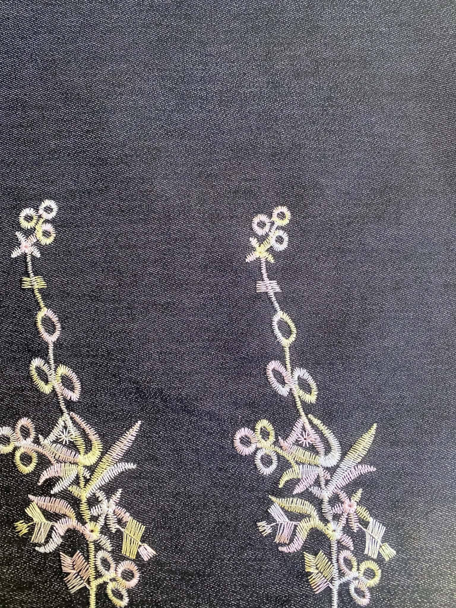 The Feel & Quality: This medium-weight denim has a professional-grade finish with a small amount of stretch for a comfortable, flexible fit. The multi-coloured threads are densely stitched, creating a vibrant, tactile contrast against the classic black denim base. It’s a versatile fabric that balances the durability of denim with the femininity of fine embroidery.